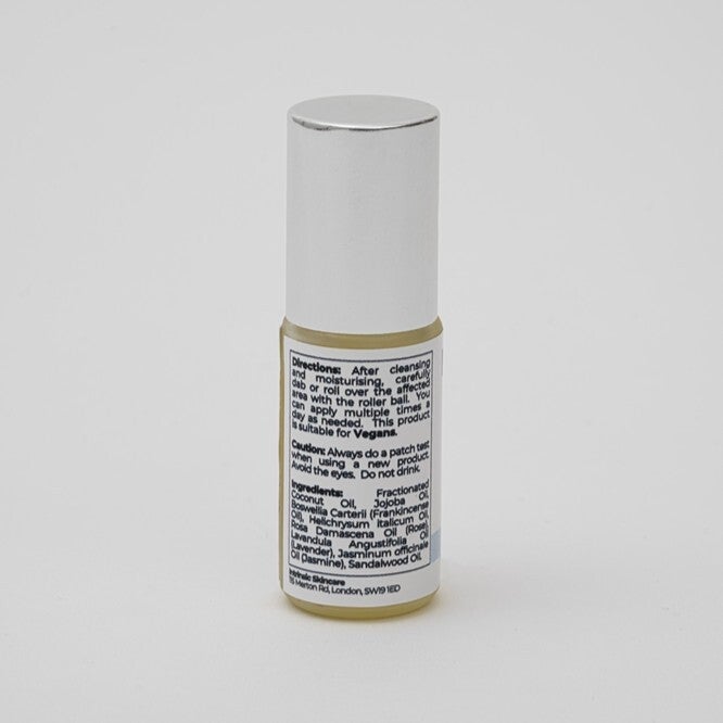 Our Scar Treatment Oil comes in a handy glass bottle with a stainless steel rollerball applicator.